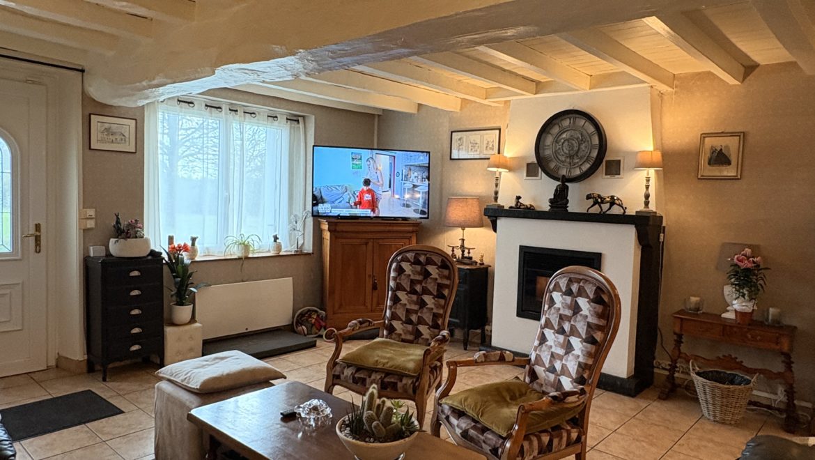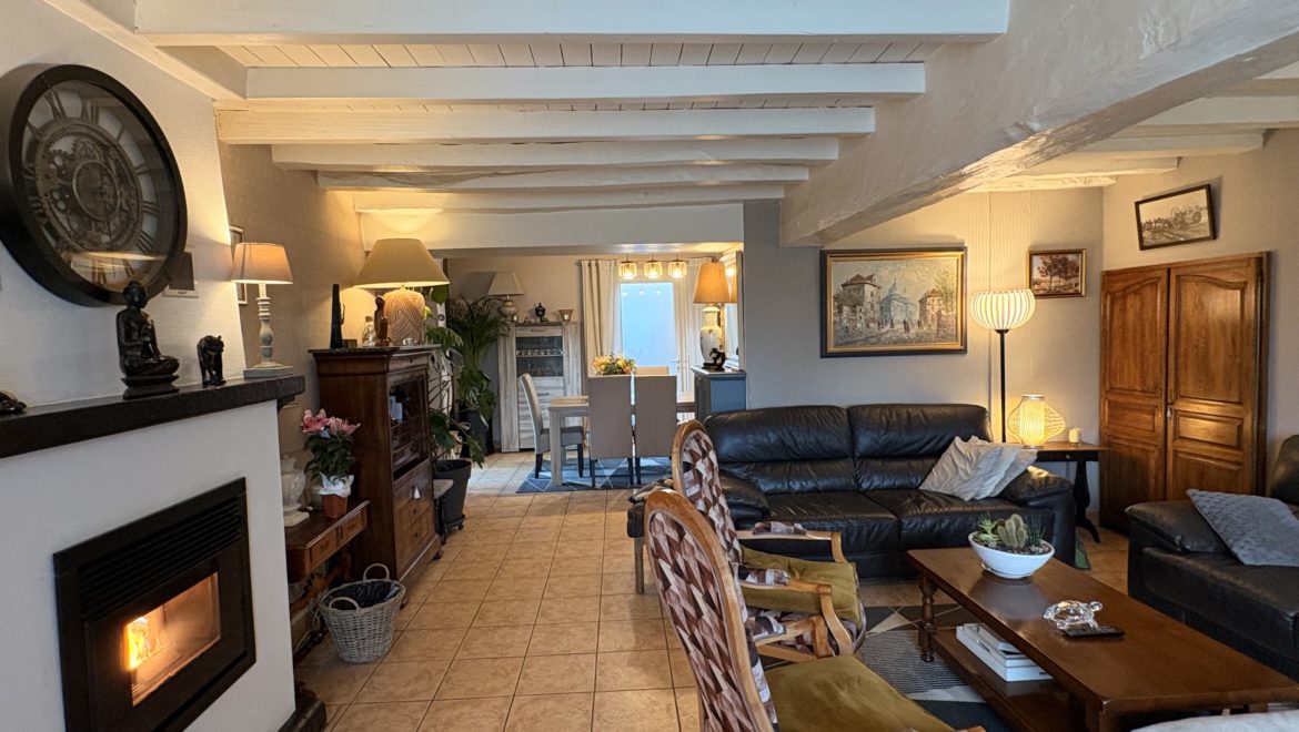 Le rez-de-chaussée s’ouvre sur un grand espace de vie lumineux regroupant le salon et la salle à manger de 47m². Les volumes sont généreux et l’insert apporte une atmosphère chaleureuse.