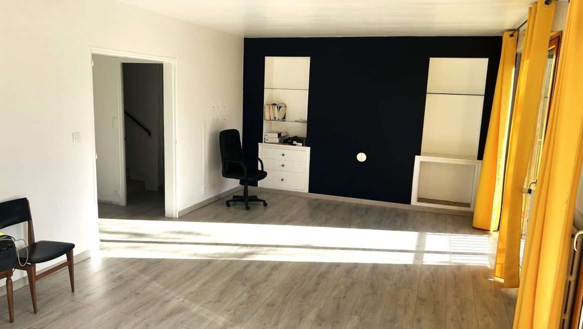 Une entrée accueillante menant vers un salon séjour spacieux et baigné de lumière,