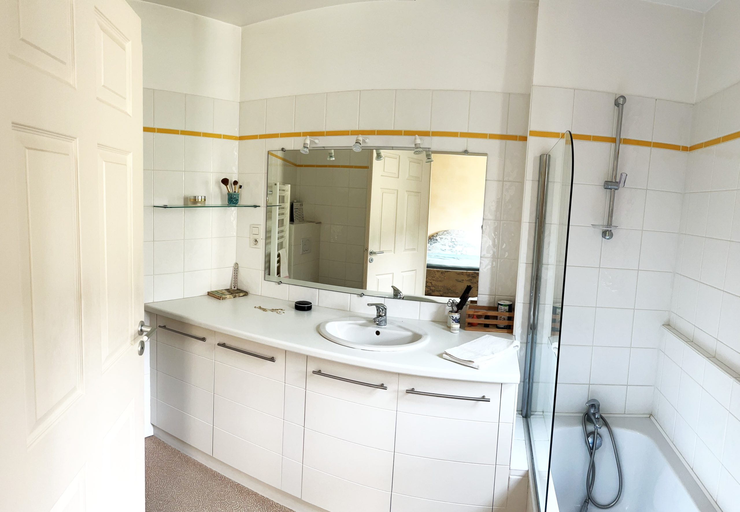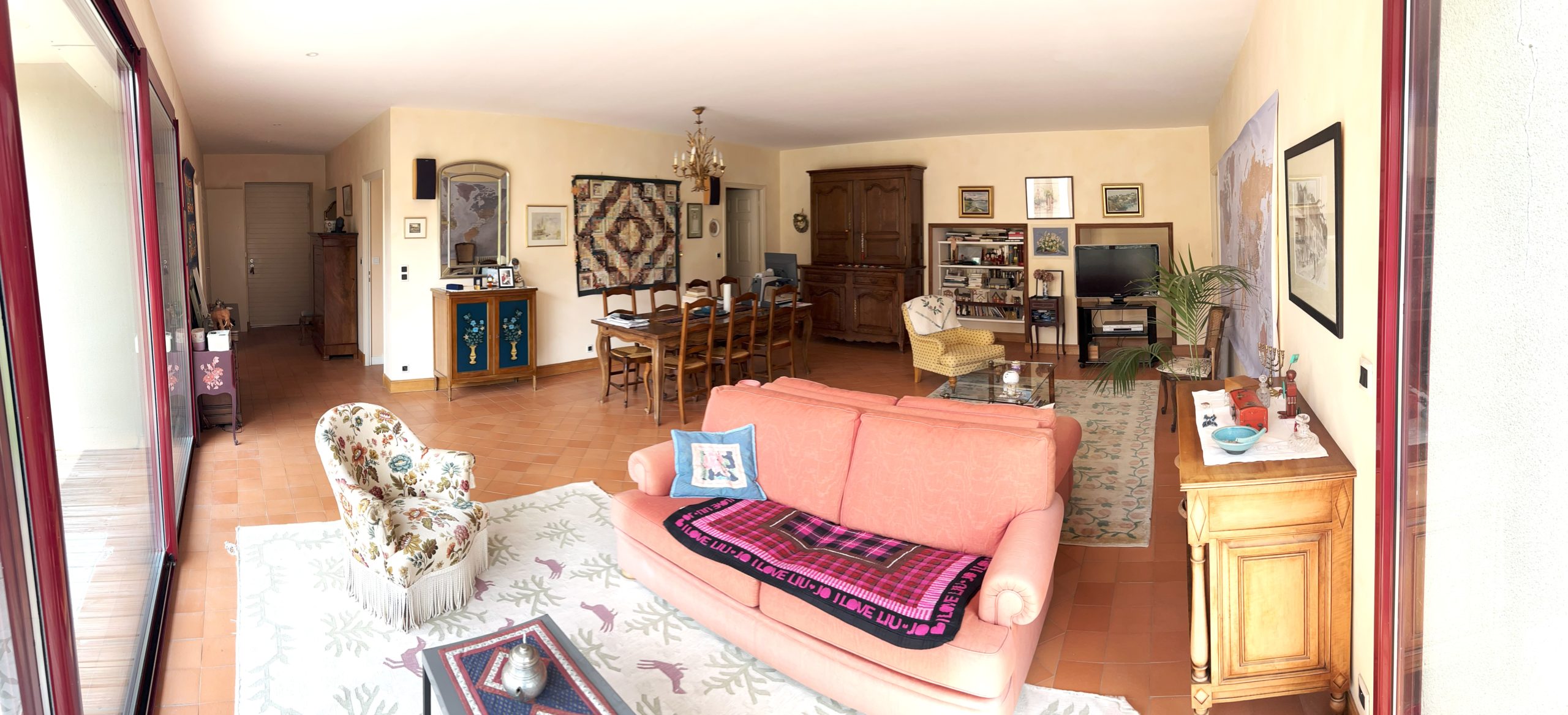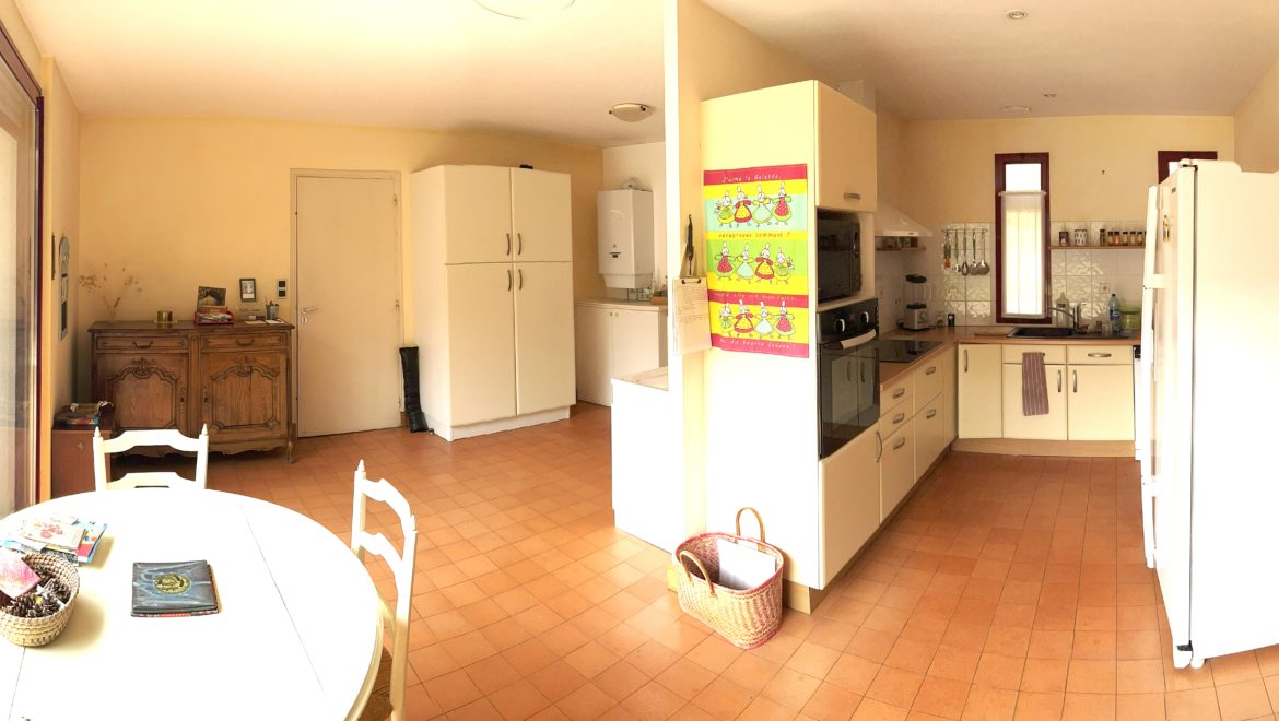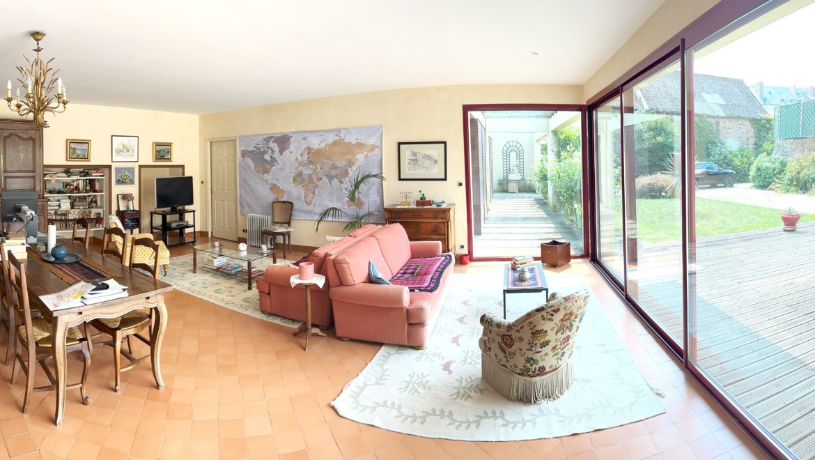 - Au rez-de-chaussée : une entrée accueillante, salon / séjour traversant de 43 m² baigné de lumière grâce à ses baies vitrées et donnant accès à la terrasse et au jardin, une cuisine aménagée et équipée ouverte sur un espace buanderie/arrière-cuisine (28 m²), une première chambre et un WC indépendant, deux suites parentales avec rangements, chacune disposant de leur salle de bains/salle d’eau et WC. Véranda et cave.