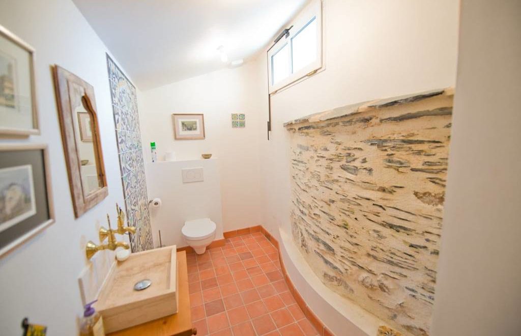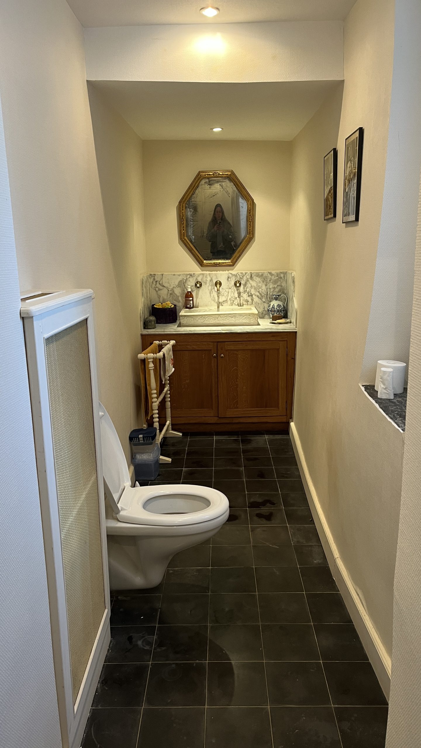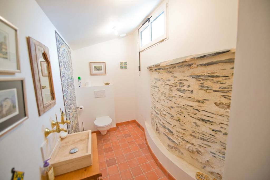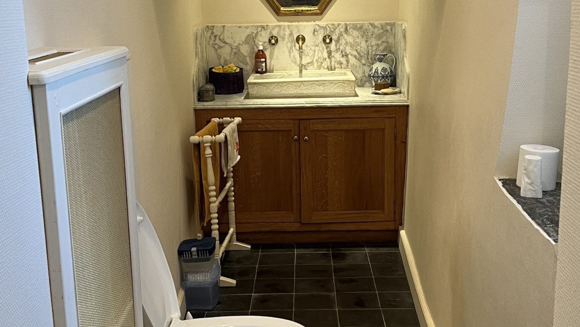 Des WC dans lesquelles le four à pain est laissé apparent, rappelant l’histoire du lieu,