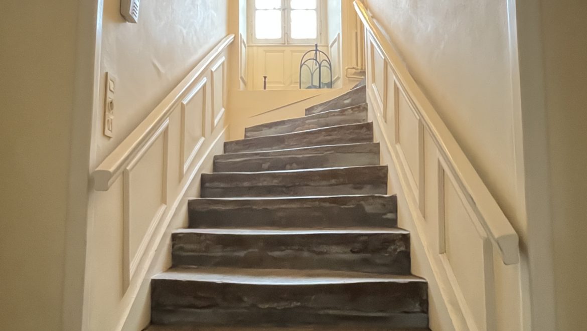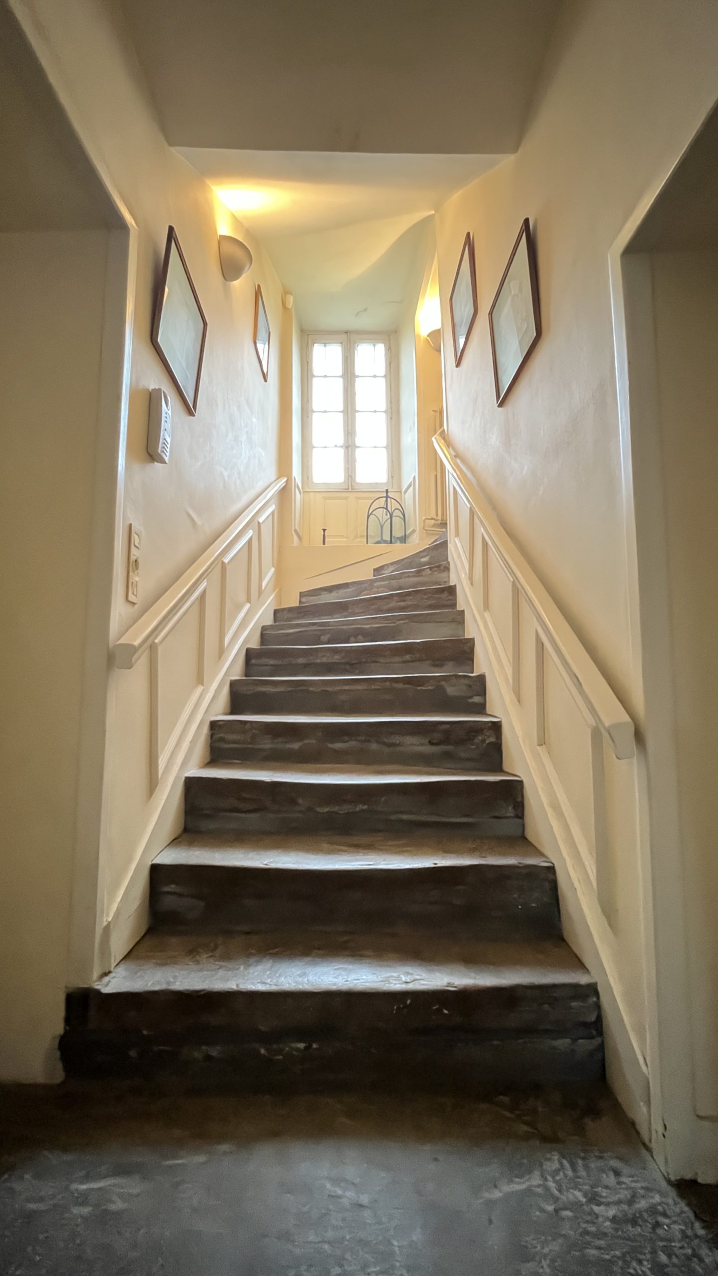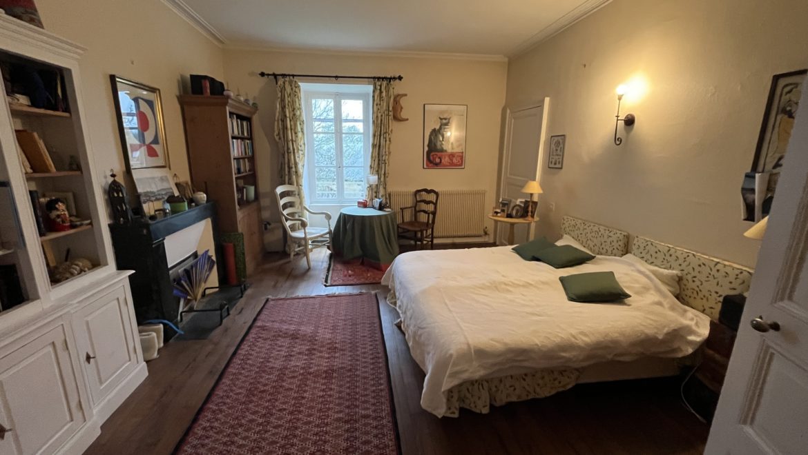 L’escalier en pierre mène aux étages, où se répartissent cinq chambres, dont une située dans la tourelle, offrant une atmosphère unique et intimiste. Les deux salles de bain au caractère authentique complètent l’ensemble.