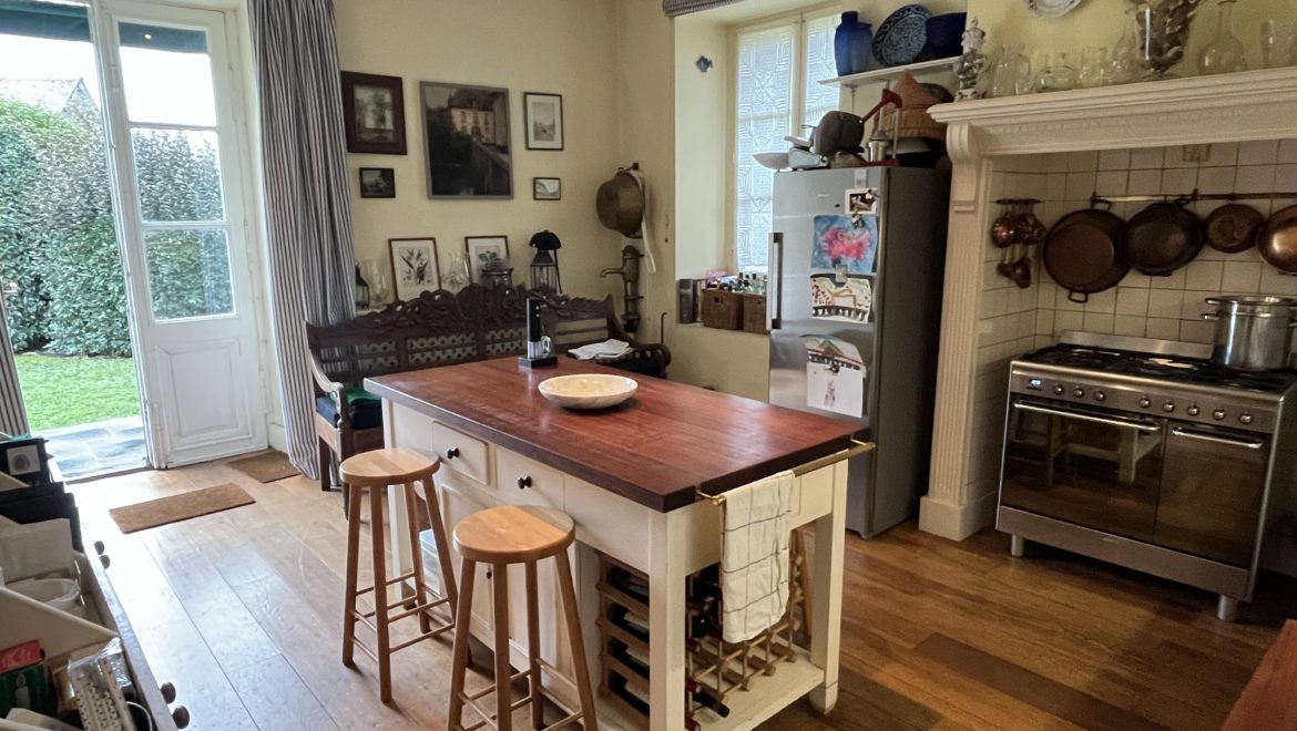 Le salon, avec son parquet ancien et sa cheminée, invite aux moments de partage. La salle à manger prolonge naturellement ces espaces de réception. La cuisine, équipée et aménagée avec un piano d’origine, est accompagnée d’une arrière-cuisine/ buanderie.